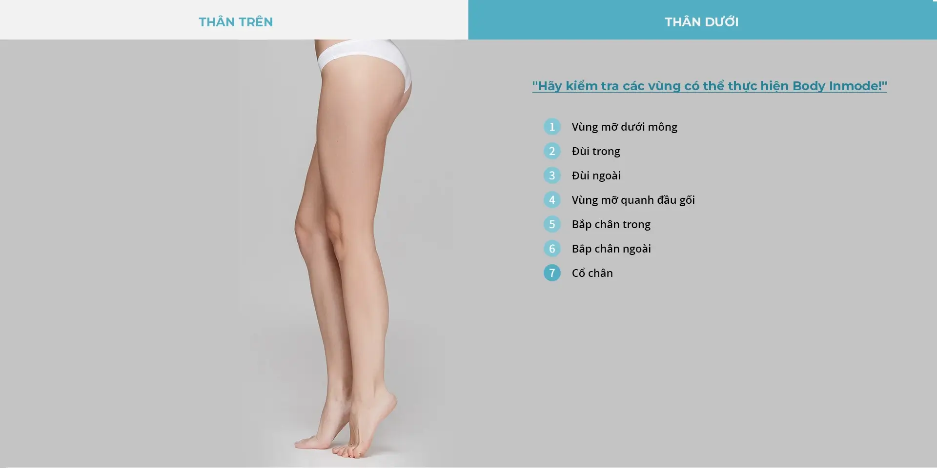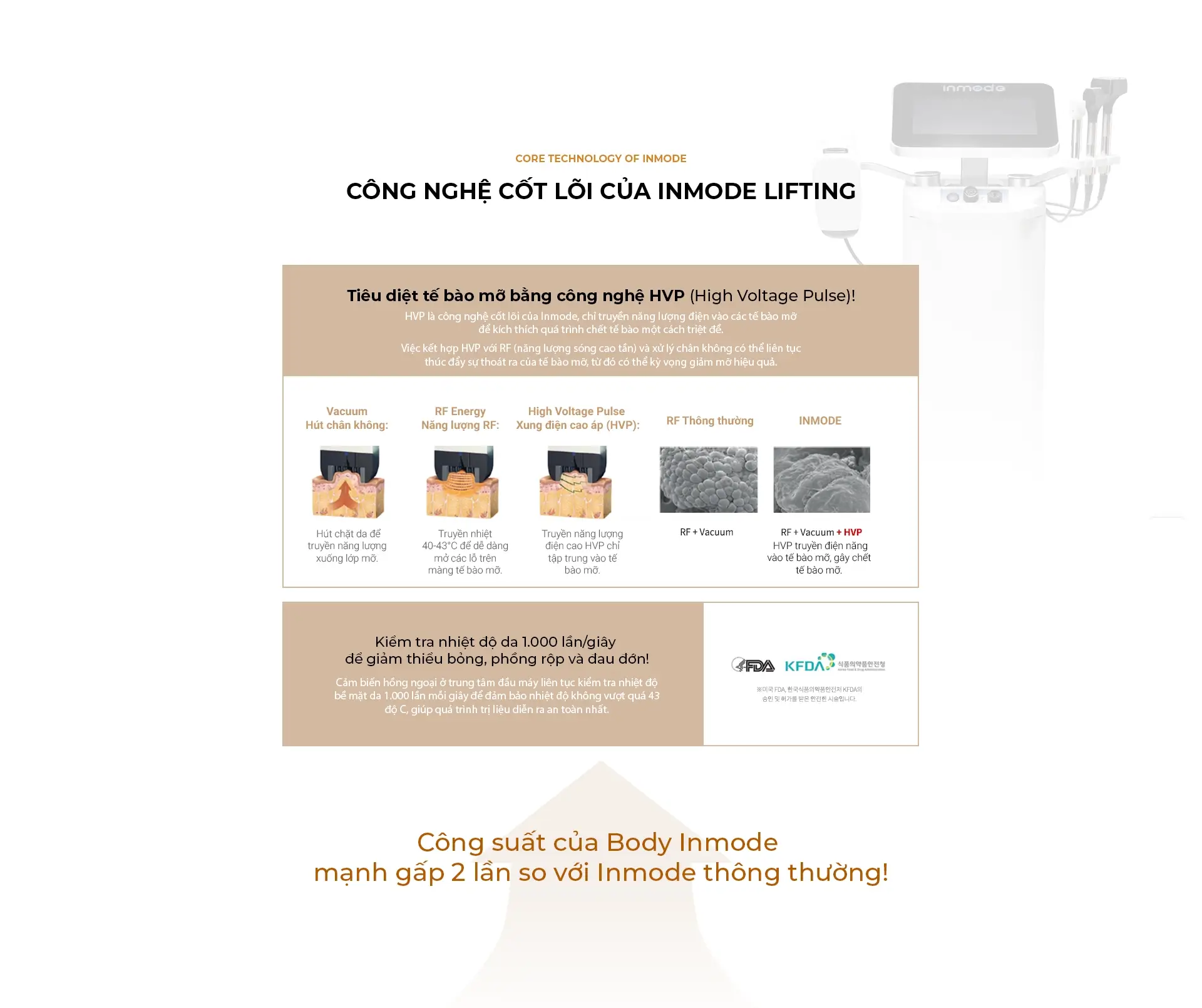 Body Inmode là liệu pháp nâng cơ chống lão hóa, sử dụng năng lượng sóng cao tần (RF) kết hợp với xung điện cao áp (HVP) truyền sâu xuống lớp cân cơ (SMAS). Phương pháp này giúp tiêu diệt các tế bào mỡ thừa, đồng thời kích thích sản sinh Collagen và Elastin ở lớp biểu bì và trung bì.