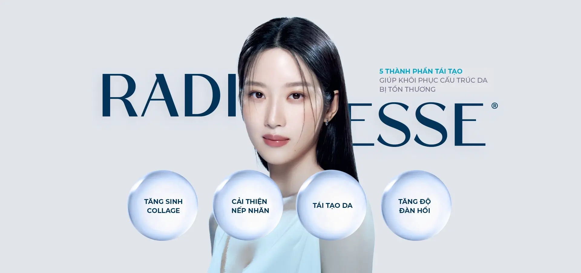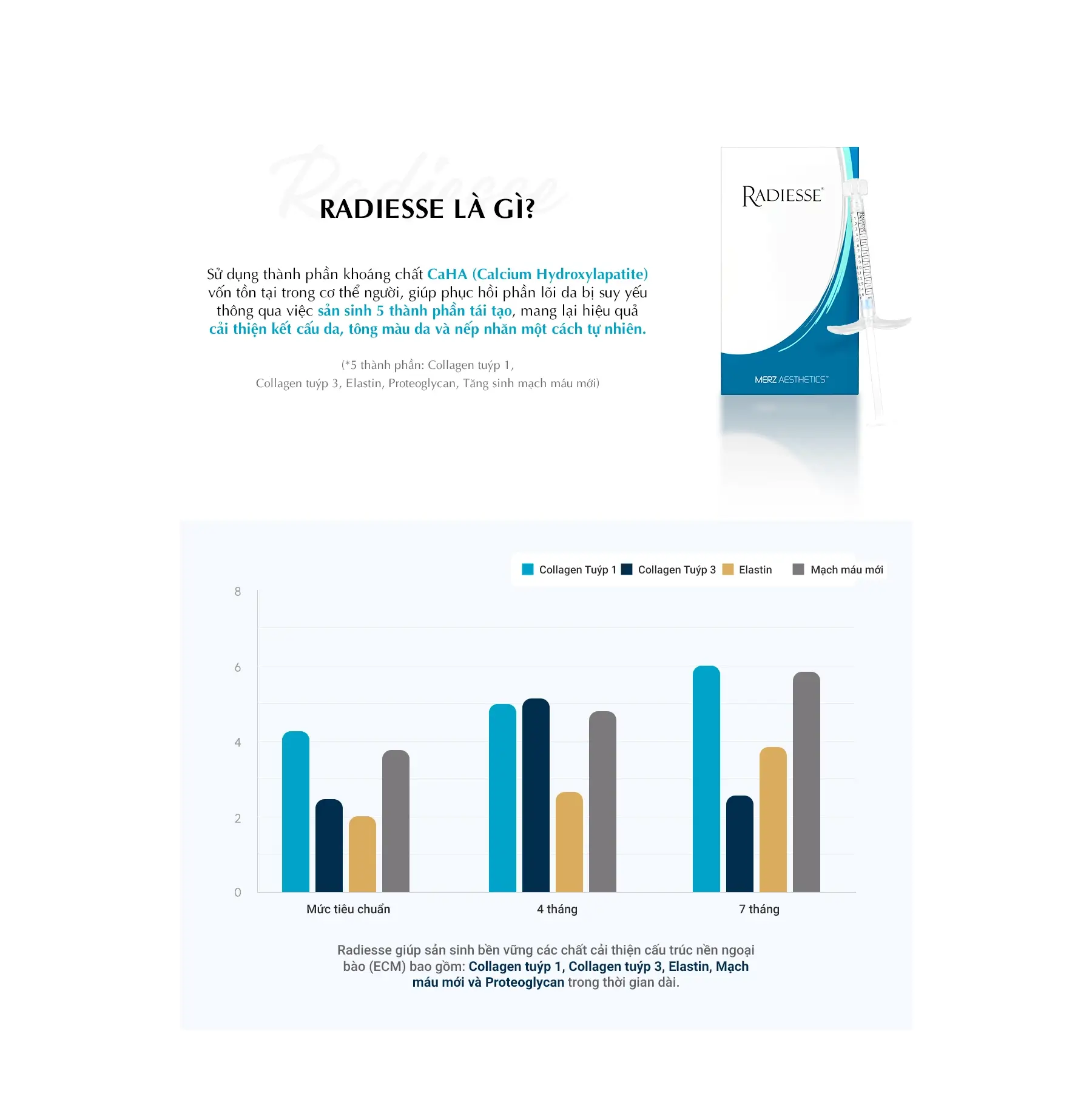 Thành phần chính của Radiesse là Canxi Hydroxylapatite (CaHA), giúp kích thích hoạt động của các nguyên bào sợi, từ đó thúc đẩy sản sinh Collagen mới.