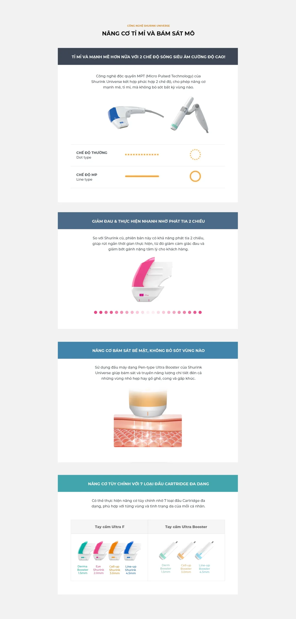 Shringk Universe có lợi thế là có thể truyền năng lượng một cách tỉ mỉ cho cả đường viền hàm, má, xương gò má cũng như các vùng cong hay quanh mắt nhờ tay cầm loại bút Ultra Booster, giúp nâng cơ kỹ lưỡng, và với hai chế độ siêu âm mạnh, năng lượng siêu âm được truyền một cách chi tiết hơn.