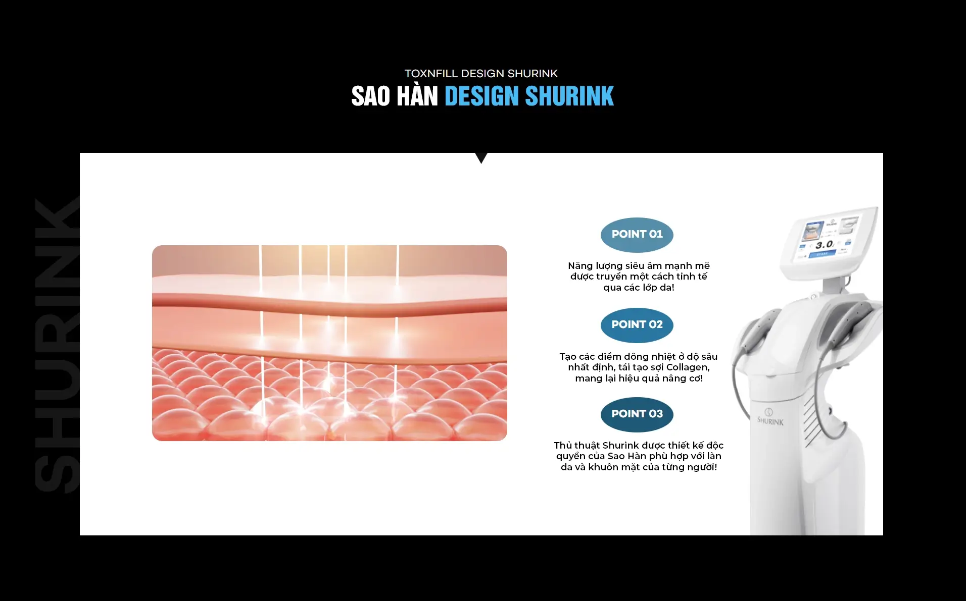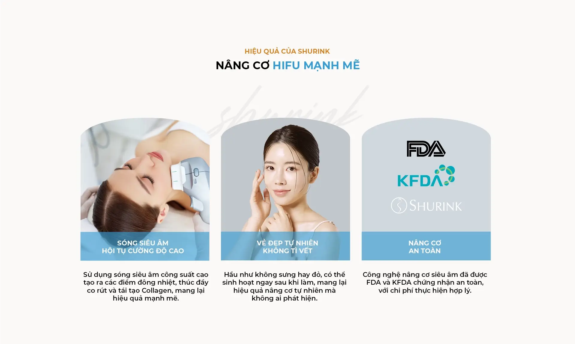 Shurink là thiết bị nâng cơ sử dụng sóng siêu âm, hội tụ năng lượng vào lớp cân cơ (SMAS) mà hầu như không gây tổn thương bề mặt da, giúp co rút các mô bị chùng nhão và mang lại hiệu quả nâng cơ.